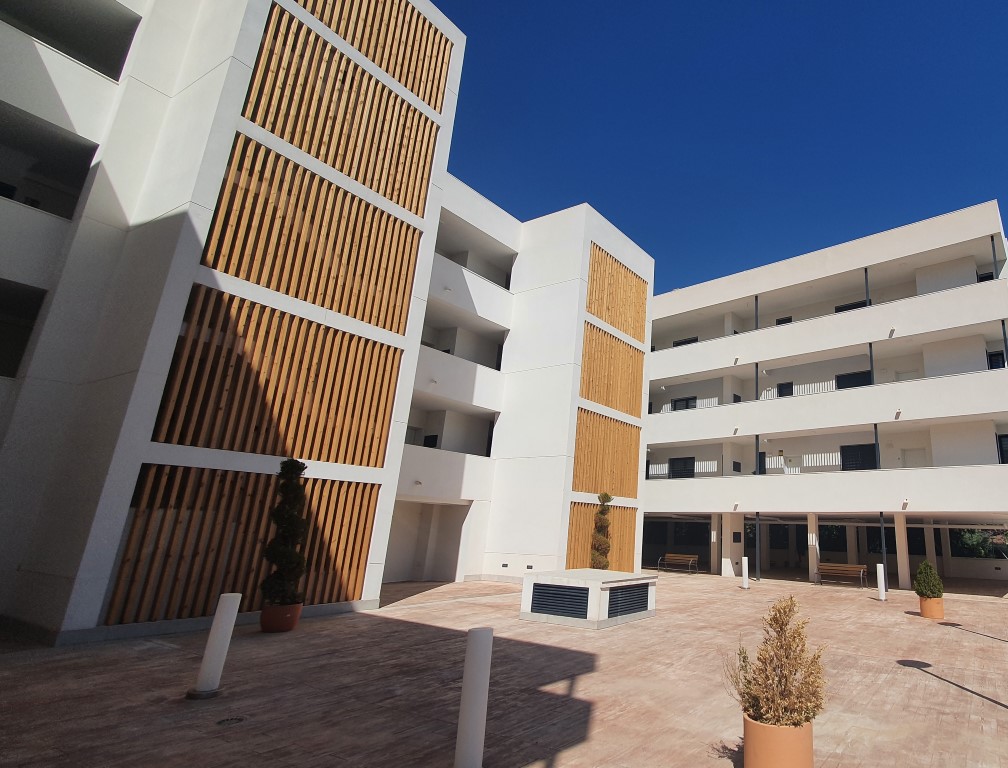 La fachada suroeste, que alberga las estancias principales de las viviendas, se abre completamente hacia las vistas panorámicas de la sierra y las zonas comunes exteriores. Este frente, diseñado con un lenguaje minimalista, incorpora un juego de volúmenes y ritmos variables, que otorgan dinamismo al conjunto sin competir con el protagonismo del paisaje natural. Cada vivienda cuenta con amplias visuales hacia las áreas recreativas, que incluyen una piscina recreativa, pistas deportivas, senderos y zonas de descanso, diseñadas para fomentar el ocio activo en contacto con la naturaleza.
