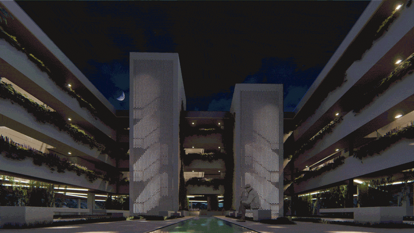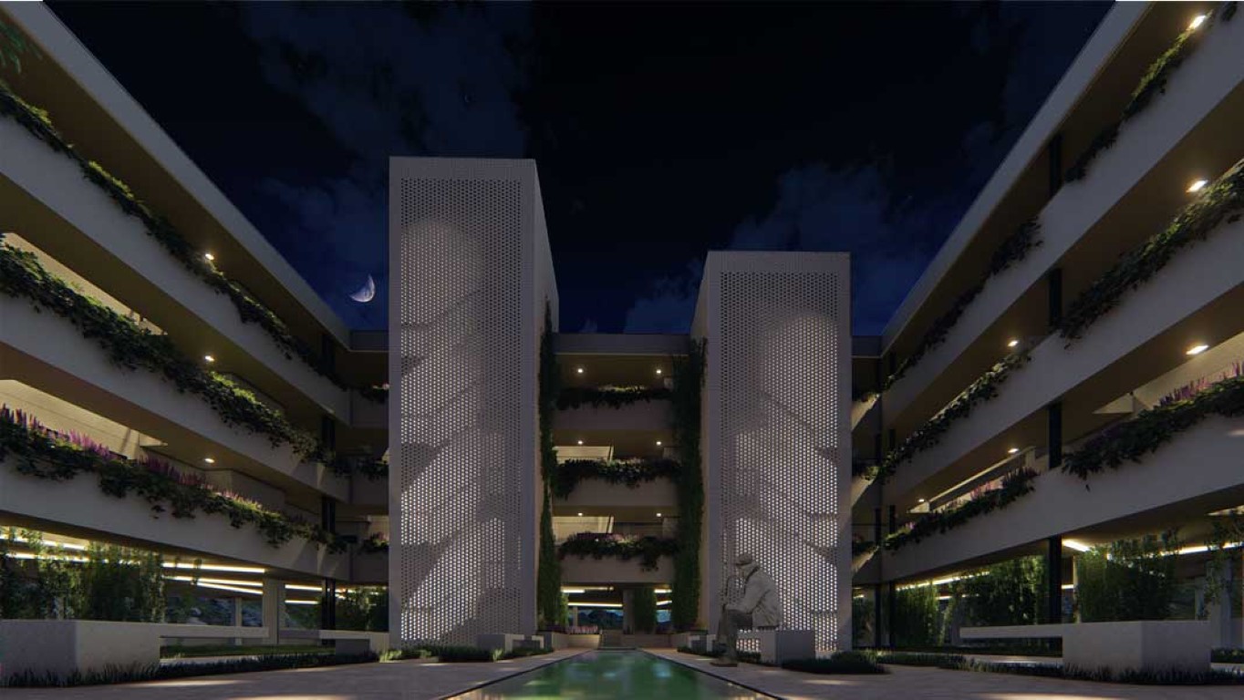 En contraposición a la horizontalidad que definen las plataformas de las galerías, se elevan dos columnas verticales, ubicadas fuera del eje principal. Estas columnas, que alojan las comunicaciones verticales del edificio, constituyen elementos escultóricos que generan un diálogo dinámico entre los distintos niveles del conjunto, enfatizando su carácter monumental y contemporáneo.