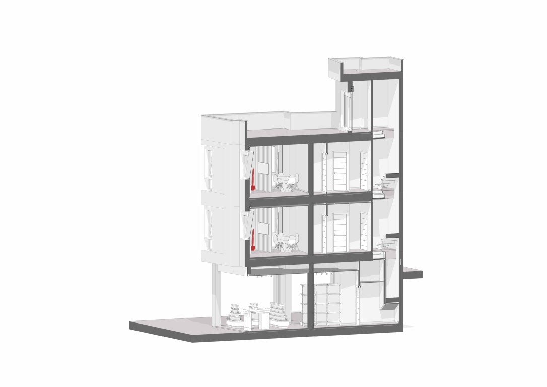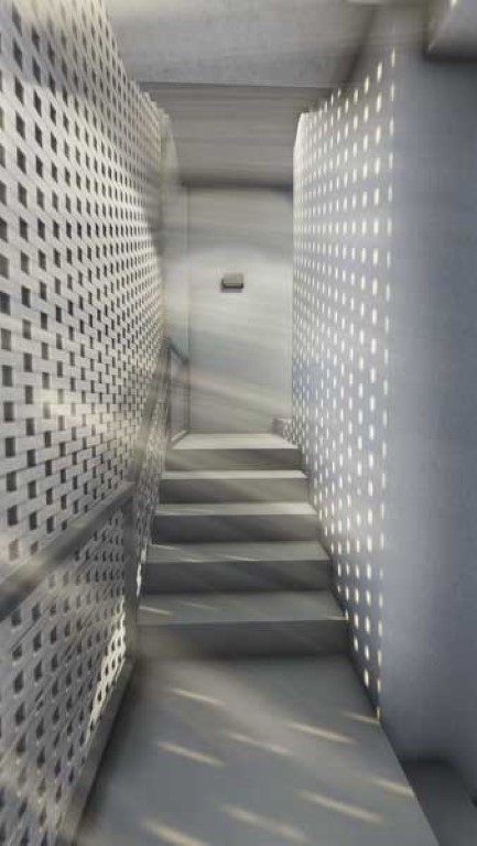 El acceso a las viviendas se realiza mediante una galería exterior perimetral en la fachada noreste, optimizando la circulación y garantizando la ventilación cruzada en todas las unidades. Este elemento actúa como un umbral funcional y estético, separando los espacios privados del entorno y potenciando la experiencia de transición entre el interior y el exterior.