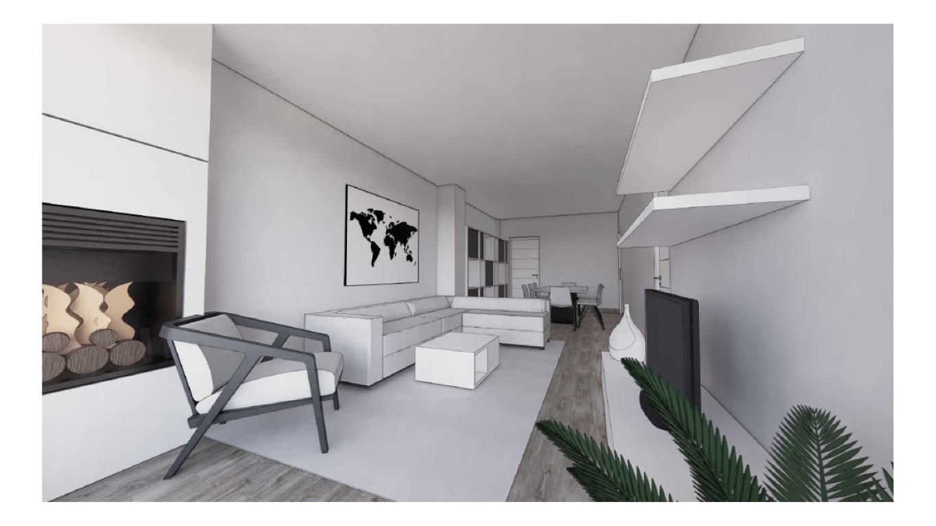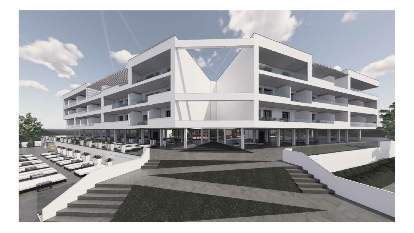 La volumetría del edificio se concibe como una gran pastilla blanca suspendida, cuya masa sólida se aligera mediante sustracciones que generan huecos estratégicos, configurando terrazas privadas que otorgan ritmo y dinamismo al conjunto. Los volúmenes principales se dividen en dos partes a través de un giro estratégico, que introduce un vacío central de forma triangulada. Este gesto escultórico, además de fragmentar y ordenar la composición, genera un juego de luces y sombras que otorga profundidad y movimiento al edificio, transformándolo en una presencia icónica dentro del paisaje.