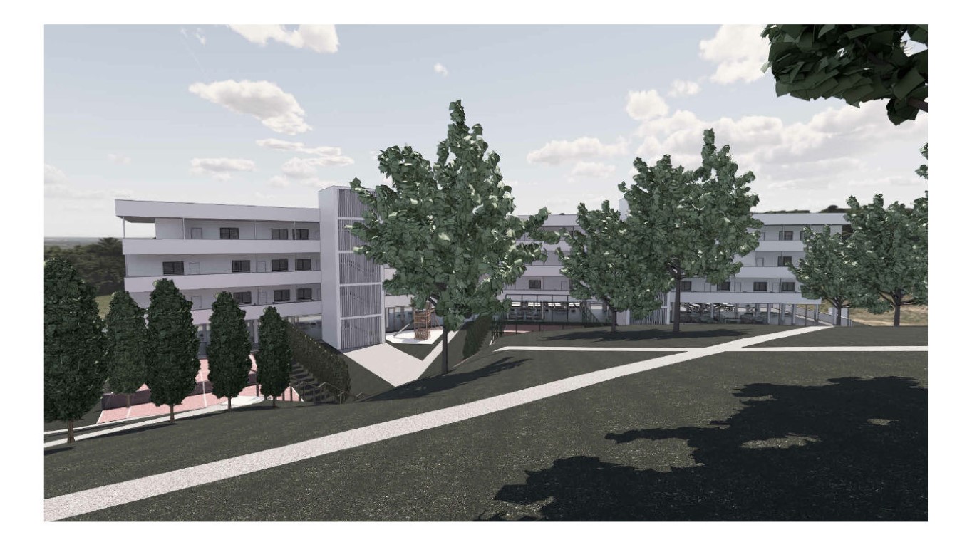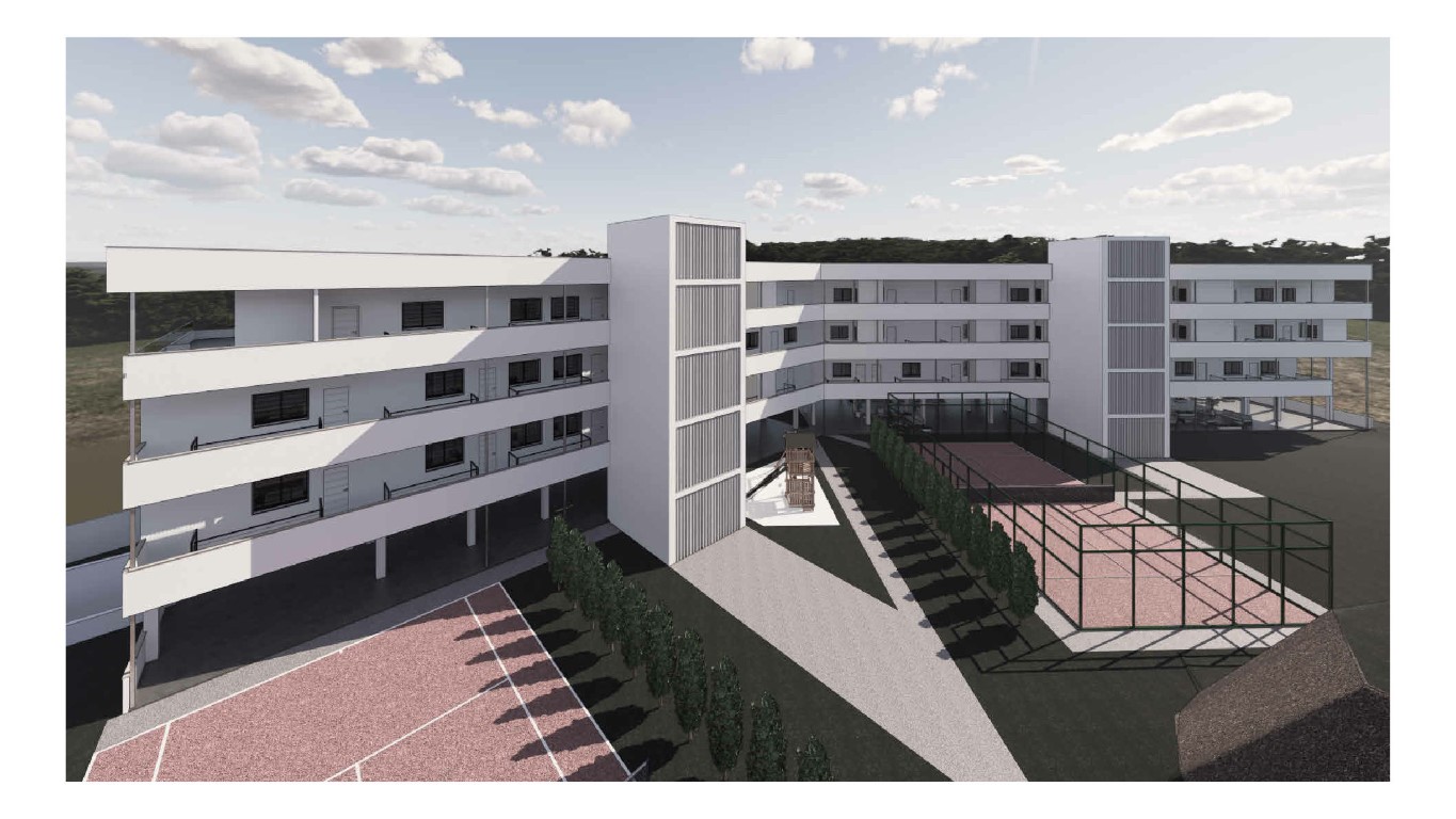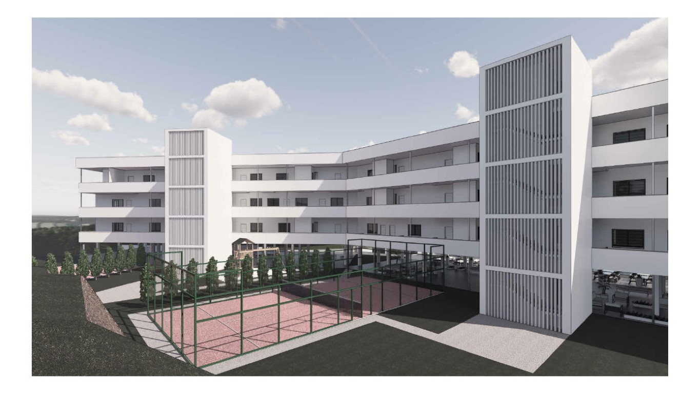 El programa contempla 33 apartamentos diseñados con criterios de confort, privacidad y conexión con el entorno. Además, se desarrollan espacios de ocio al aire libre que incluyen zonas refrescantes con piscinas, un lounge bar, dos pistas deportivas, un mirador en la cota más alta y senderos arbolados que recorren la parcela. La propuesta apuesta por equilibrar la vida urbana con una experiencia residencial inmersa en un entorno natural, priorizando estrategias de integración paisajística y sostenibilidad espacial.