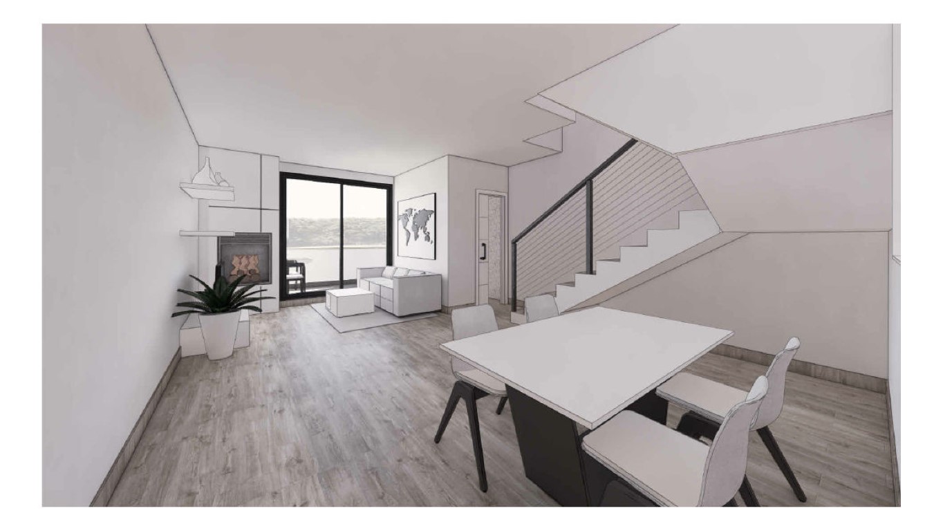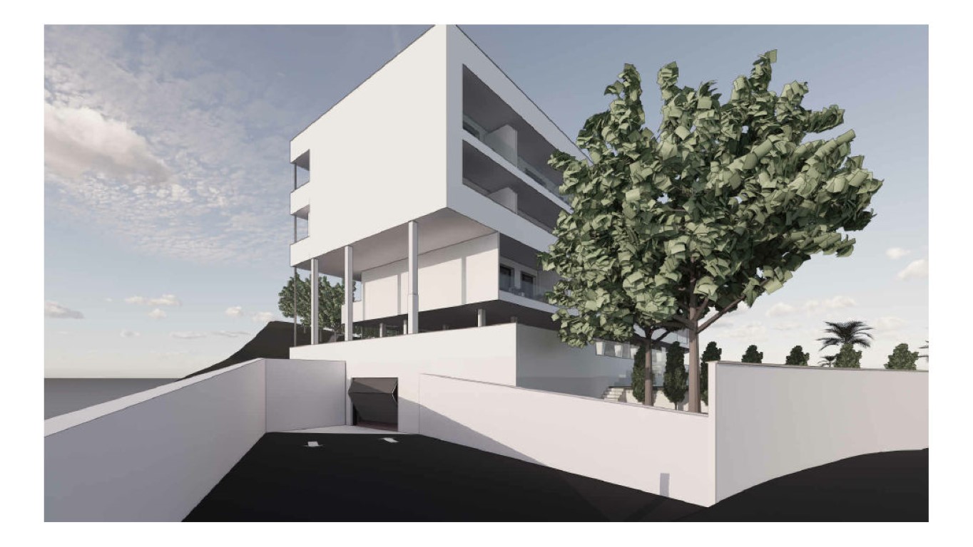 El volumen principal se configura en cuatro niveles, donde la planta baja actúa como basamento libre, y las plantas superiores, que albergan los apartamentos, se elevan y se desconectan del terreno sobre esbeltos soportales. En el nivel semisótano se encuentra el garaje, completamente enterrado en la parte trasera, aprovechando el desnivel del terreno para resolver la funcionalidad técnica y estructural sin alterar la estética del conjunto. Esta disposición genera un marcado escalonamiento que no solo respeta la topografía, sino que también la transforma en un activo arquitectónico.