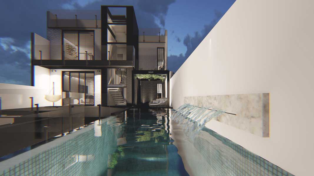 El volumen edificatorio divide dos espacios exteriores, patios. Centrándonos en dichos patios, encontramos por tanto, el principal, de acceso tanto a las plantas sobre rasante como bajo rasante. Además, el citado patio, es utilizado para actividades de ocio al exterior para la familia, como es el caso de la proyección de la piscina, una piscina rebosante aprovechando la pendiente del acceso. El patio trasero está dividido en dos alturas, conectando así planta baja y cubierta, y aportación de iluminación natural y privacidad a las estancias internas.