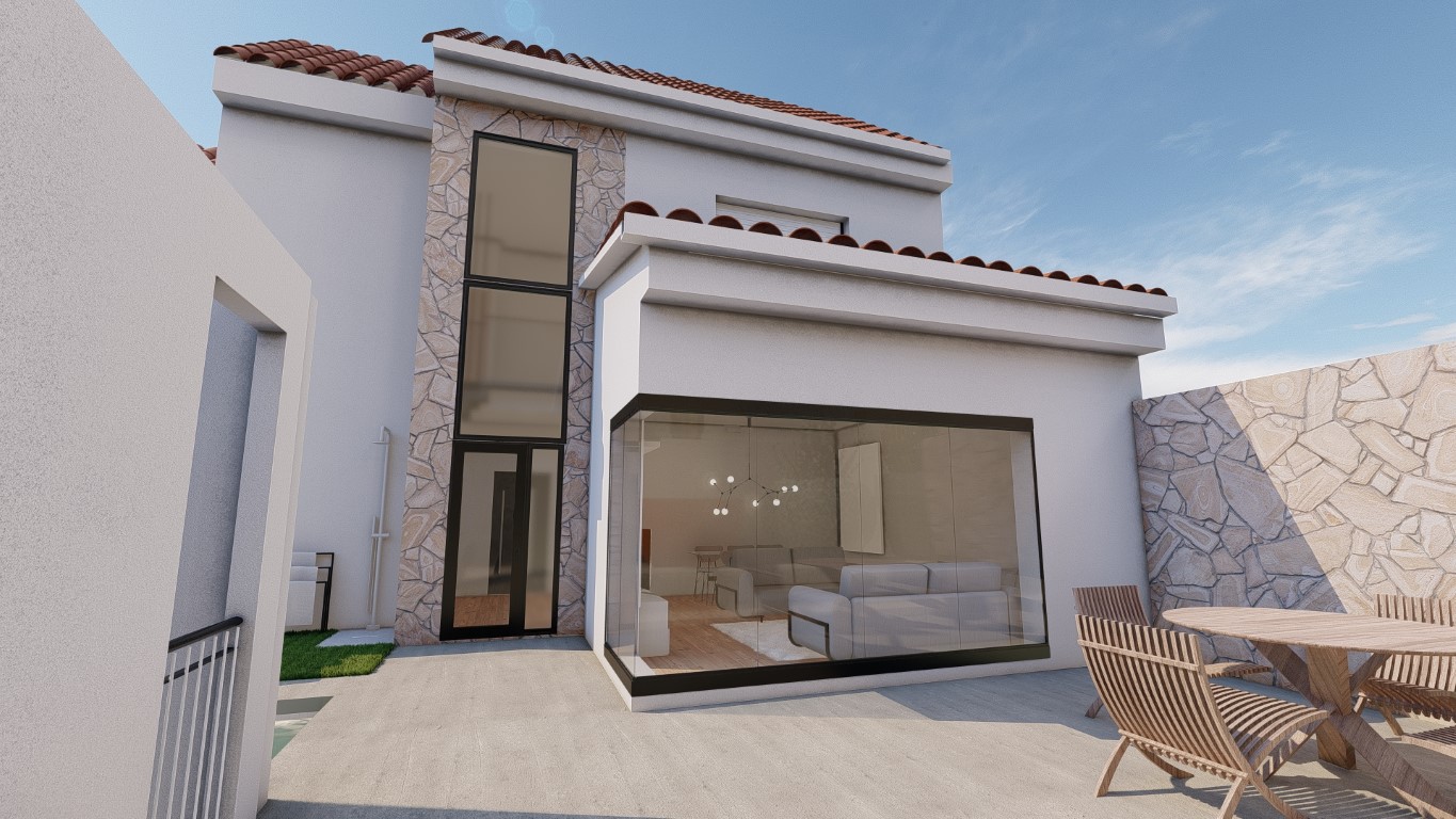 El volumen edificatorio divide dos espacios exteriores, patios. Centrándonos en dichos patios, encontramos por tanto, el principal, de acceso tanto a las plantas sobre rasante como bajo rasante. Además, el citado patio, es utilizado para actividades de ocio al exterior para la familia, como es el caso de la proyección de la piscina, una piscina rebosante aprovechando la pendiente del acceso. El patio trasero está dividido en dos alturas, conectando así planta baja y cubierta, y aportación de iluminación natural y privacidad a las estancias internas.