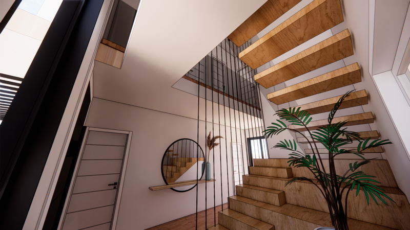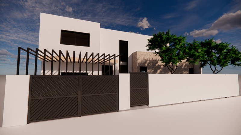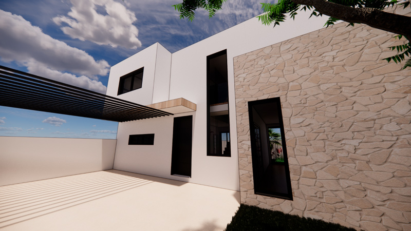 El diseño volumétrico de la vivienda hemos querido que fuese un juego de intersecciones y superposiciones. Los volúmenes se entrelazan, formando un conjunto dinámico de salientes, entrantes y vuelos, creando un ritmo visual y espacial que desafía la monotonía.