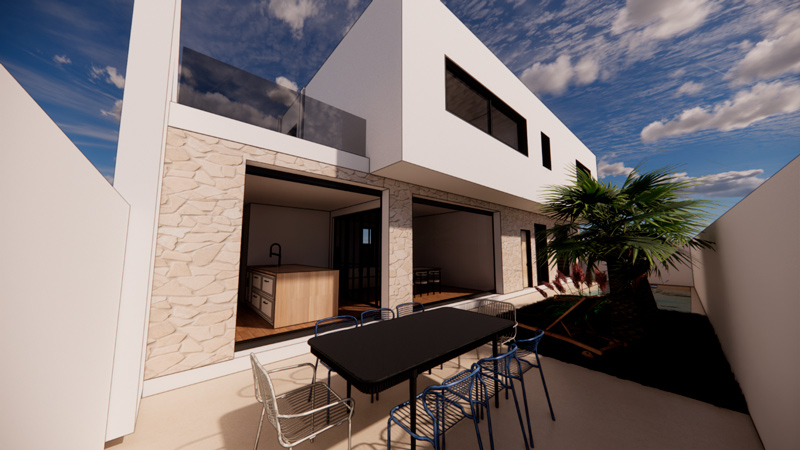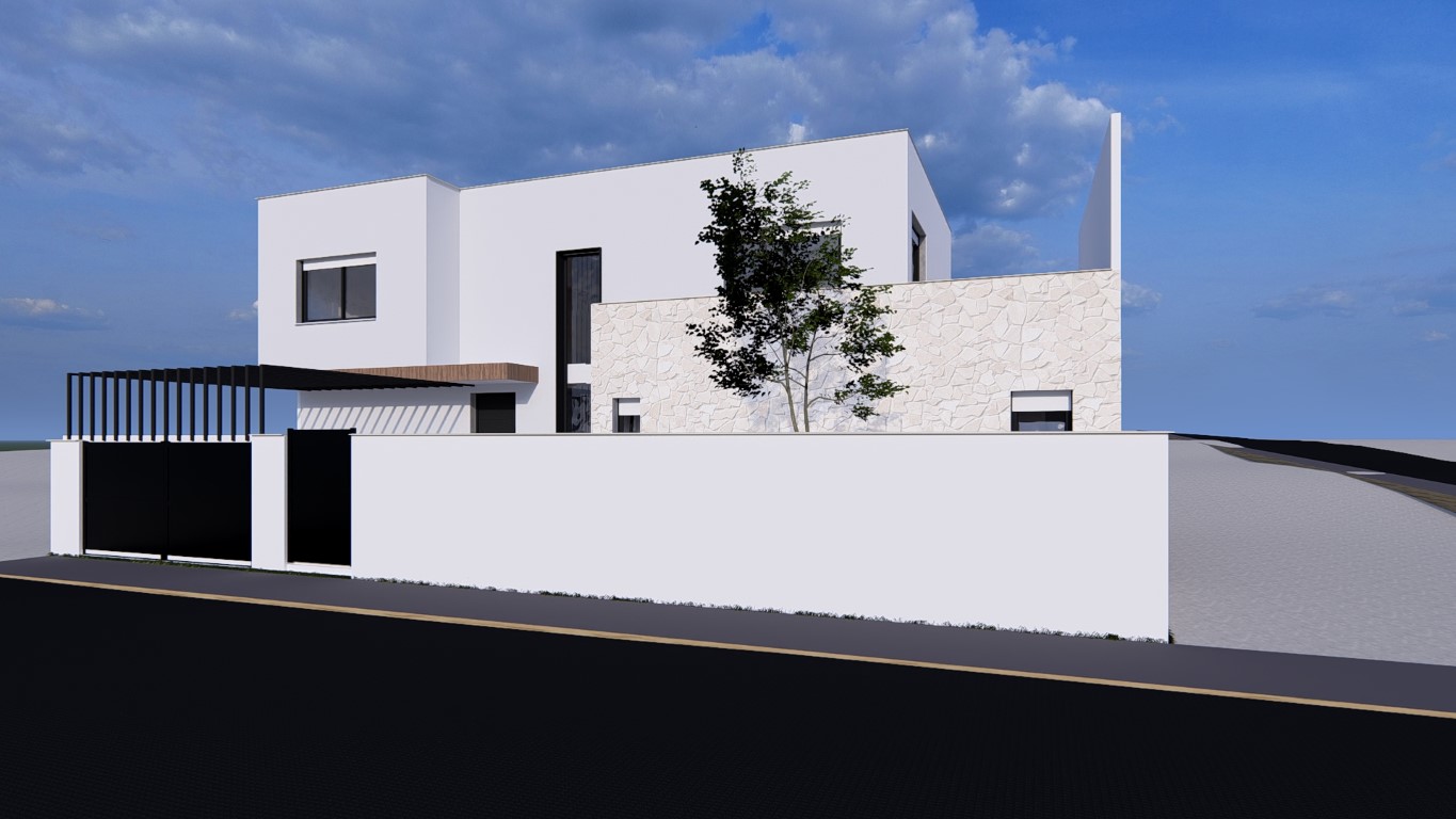 Esta vivienda, situada en una parcela alargada y tranquila, se ha diseñado para ser un manifiesto de modernidad donde los materiales nobles y la geometría se conjugan en una armonía de volúmenes. La estructura principal está construida con piedra y hormigón blanco, estableciendo un diálogo entre la pureza del blanco y la robustez de la piedra, mientras que la madera se erige como un elemento de calidez que contrasta y complementa el conjunto.