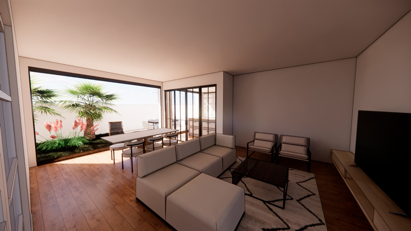 En la planta baja, la vivienda se sitúa entre dos patios, delantero y trasero, generando un equilibrio entre lo interior y lo exterior. El acceso se realiza a través del patio delantero, conduciendo a un espacio de recepción con doble altura, que se convierte en el núcleo articulador de la casa. Este núcleo, dominado por una escalera que conecta los niveles, distribuye el flujo hacia las principales áreas de convivencia: el salón-comedor y el patio trasero. En esta planta, se dispone además de un baño y un dormitorio de invitados.
