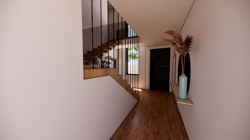 El núcleo de la vivienda es su entrada, concebida como el punto central de acceso y distribución. Este espacio no solo organiza el flujo hacia las diferentes áreas, sino que también establece un diálogo vertical entre las plantas. Aquí, la doble altura se convierte en un vacío que potencia la percepción del espacio y la luz. La galería funciona como un puente, conecta las estancias privadas del segundo nivel, mientras que la escalera, dividida en dos tramos con diseños contrastantes, se convierte en un elemento arquitectónico destacado. El primer tramo, macizo y rotundo, se despliega como una grada, mientras que el segundo tramo, más ligero y volado, queríamos que ofreciera la sensación de ingravidez. Este espacio es acompañado por un ventanal de gran altura, que actúa como un lienzo de luz natural, bañando el espacio con una luminosidad envolvente.