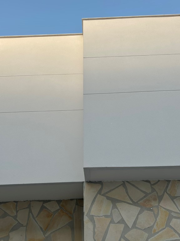 Por último, otro detalle de nuestra propuesta ha sido querer reforzar, el gran papel histórico defensivo que ha tenido Baños de la Encina, por el cuál, en la fachada lateral que proyecta directamente a la calzada, se ha diseñado a modo de muralla de piedra todo el frente de planta baja, el cuál protege la vivienda, nuestro cubo blanco situado sobre él.