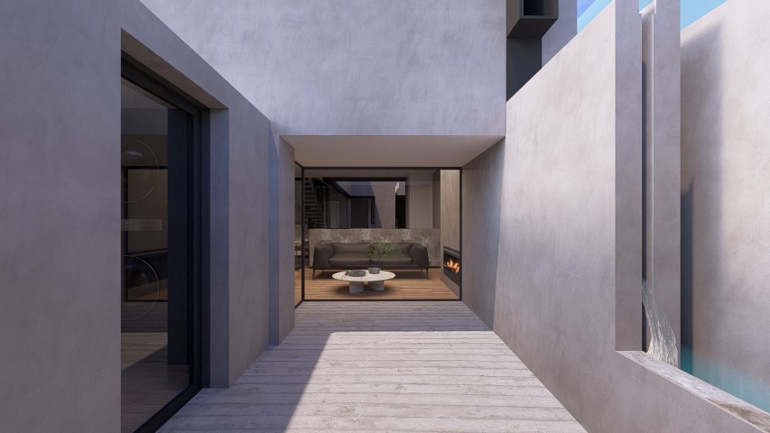 El patio perimetral, ubicado en el límite de la parcela, funciona como un filtro entre lo público y lo privado, estableciendo una barrera visual y acústica respecto al entorno urbano. Este espacio incorpora un elemento vertical clave, que combina las funciones de fuente exterior y chimenea interior, integrando simbólicamente los elementos naturales de tierra, aire, fuego y agua en el diseño.