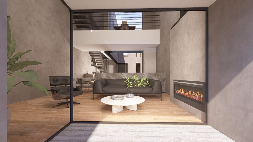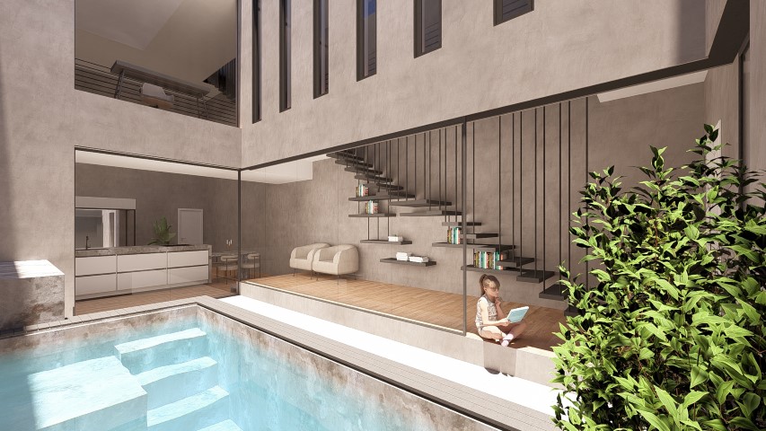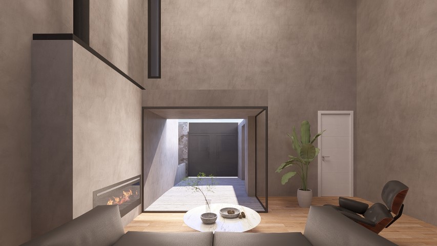 El diseño de esta vivienda unifamiliar propone un refugio introspectivo que prioriza la privacidad de su usuario, un hombre y su perro, aislándolos del ajetreo urbano. Emplazada en un solar rectangular entre medianeras, la vivienda se organiza en torno a dos patios interiores que articulan las estancias y maximizan la entrada de luz natural, logrando un equilibrio entre funcionalidad y confort.