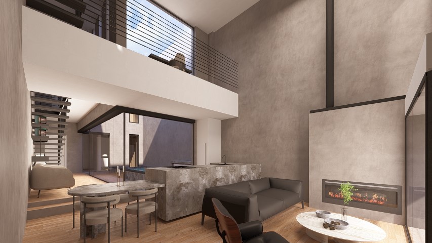 El patio central es el núcleo visual y espacial de la vivienda, distribuyendo las áreas habitables a su alrededor y creando una relación directa entre los interiores y el exterior. Este espacio potencia la iluminación y ventilación natural, mientras que su galería perimetral actúa como un área de transición y descanso. En la planta baja, esta galería ofrece un rincón para la lectura junto a la alberca, aprovechando la diferencia de cota del suelo para integrar la solería como mobiliario. En la planta alta, se transforma en un corredor que captura la variabilidad de la luz y conecta con las zonas privadas.