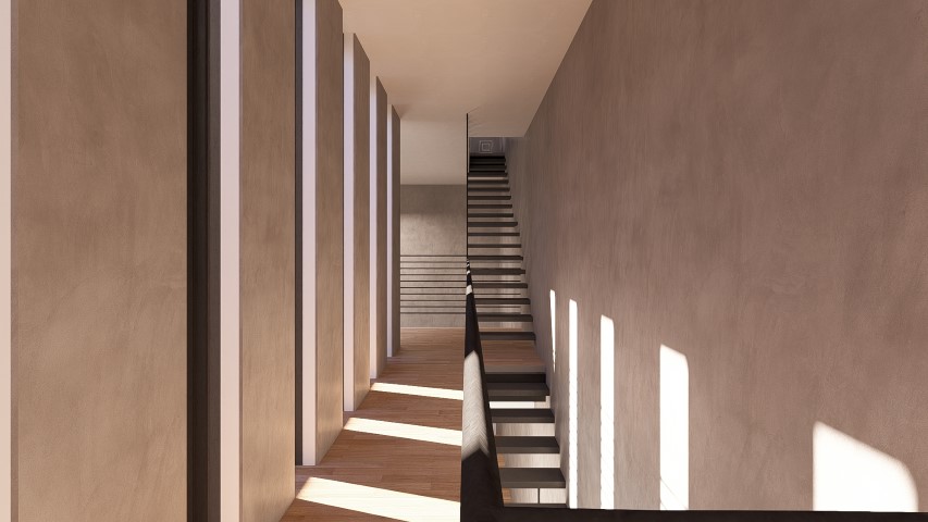 Un dormitorio principal, con baño privado y vestidor, se posiciona estratégicamente al fondo de la parcela para garantizar la máxima privacidad. Y por último, un estudio situado en la galería superior, con vistas a la doble altura de la zona diurna, estableciendo una relación visual y espacial con los patios.