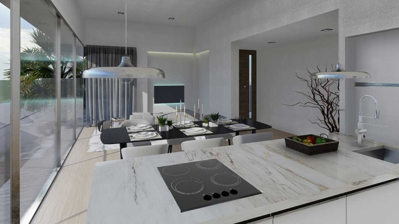 Se proyecta en una única planta los espacios funcionales, divididos en la vivienda en dos volúmenes, un espacio de día, abierto diáfano, de ocio, comedor y cocina conviviendo diversas actividades en mismo habitáculo. Y una zona de noche, el cual se accede a través de un distribuidor conectado al hall de entrada, separado, por donde se acceden a cada una de las habitaciones de descanso y el baño compartido