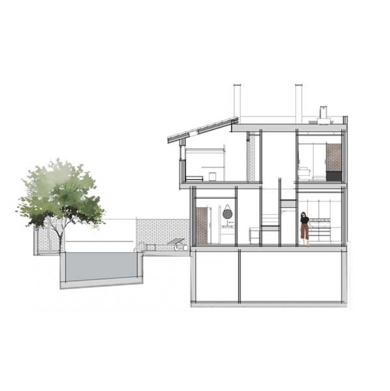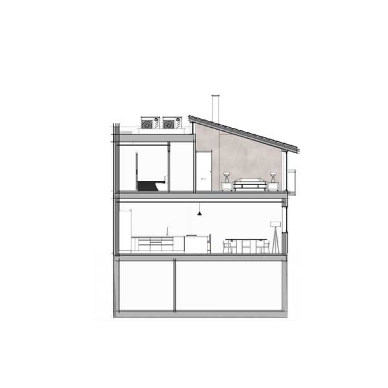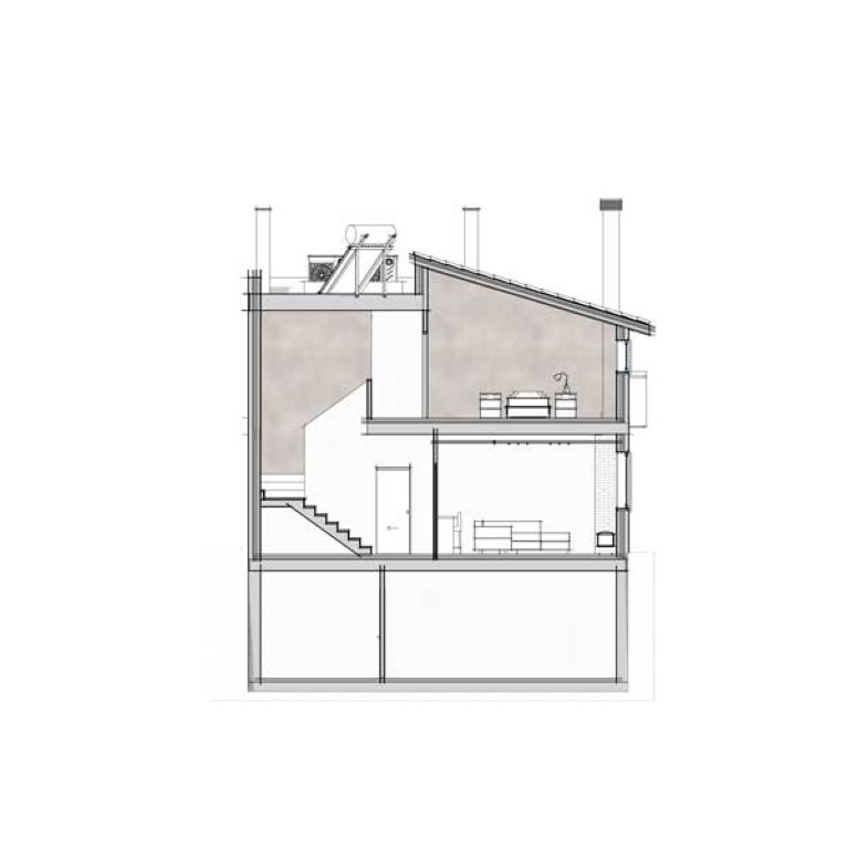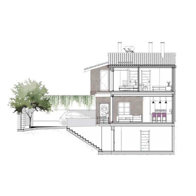 En la vivienda se divide la funcionalidad de la vivienda en tres planos horizontales: en planta baja, encontramos la zona diurna, en planta alta, la zona nocturna y en el sótano la zona de almacenamiento e instalaciones. Por tanto, encontramos en este proyecto, un espacio interesante, un amplio salón-comedor, el cual, se accede desde el patio o el hall, forma, y conectado de forma abierta pero oculta desde el exterior, a la cocina, la cual, se accede desde el mismo salón o el hall, conectados por tanto, el salón y la cocina formando un gran espacio en L.